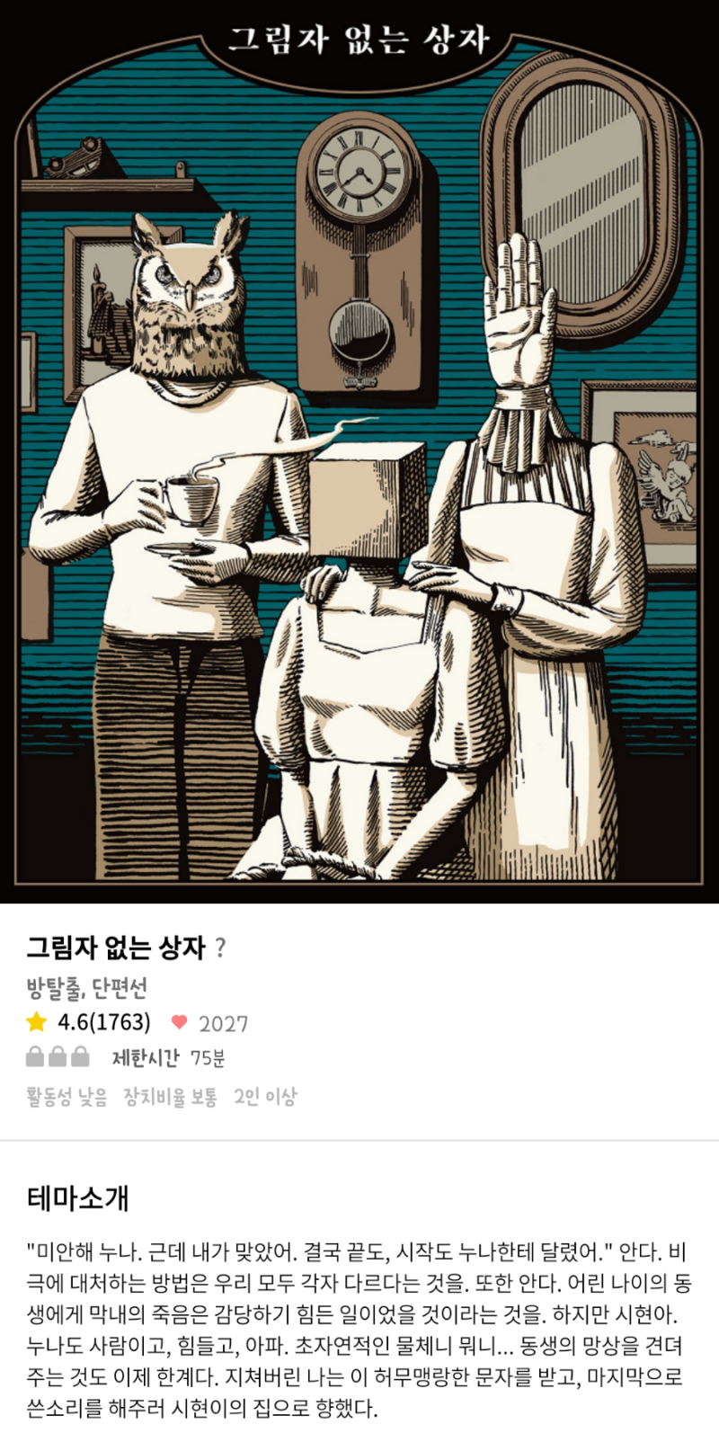 먼저, 그림자 없는 상자! 이 작품은 최우수 SF/판타지 부문에서 상을 받았습니다. 난이도는 별 3개로 단편선을 처음 접하시는 분들에게 좋은 테마입니다. 저희는 탈옥실에 가본지도 꽤 됐고, 처음이라 저희는 힘상을 선택했습니다. 플레이시간은 75분, 가격은 1인당 27,000원입니다. 단편선에는 두 가지 주제가 있는데, 하나는 ‘사람들은 그것을 행복이라 부르기로 했다’이다. 이 테마는 2022년 올해의 테마상을 수상했습니다. 난이도는 별 4개, 플레이시간은 80분, 가격은 1인당 28,000원이다. 다음에는 삭행부로 가보겠습니다! 스토리에서 이어지는 스토리는 아니지만, 세계관이 연결되어 있어 게임을 해본 분들에게 도움이 될 것 같습니다. 단편선 방문 시작 15분 전에 도착하는 것이 가장 좋습니다. 화장실에 가서 미리 짐을 꾸릴 시간도 부족했습니다. 화장실이 하나밖에 없어서 4명이 번갈아 가며 화장실을 다녀오느라 조금 늦었습니다. 또한 판단라인에서는 신발을 벗고 슬리퍼로 갈아입어야 합니다. 실내화는 사이즈가 다양합니다. 방문하실 때 이 점 꼭 참고해주세요! 그림자 없는 상자 리뷰입니다. 그림자 없는 상자 리뷰입니다. 우리는 한 번도 탈출실에 가본 적이 없는 4명이 일행으로 갔다. 힌트를 3번 사용하여 9분 37초 남기고 탈출에 성공했습니다! 성공하면 이런 동화책을 받게 됩니다. 처음 단편선 예약을 했을 때 스토리가 얼마나 훌륭하고, 기기가 좋다는 이야기를 많이 들었고, 스토리가 정말 탄탄했습니다. 억지로 하는 부분은 없고 몰입해서 플레이할 수 있습니다. 분편선 홈페이지에도 공개된 이야기를 설명하자면, 어린 나이에 남동생의 죽음을 경험하고 그를 찾아 나선 누나의 이야기다. SF/판타지 부문에서 상을 받았으니 당연히 판타지와 관련된 이야기겠죠? 더 말하면 스포일러가 될 수 있으니 여기서 마치겠습니다 하하. 그리고 겁쟁이로서 그것에 대해 무섭거나 놀라운 것은 없었습니다! 그들은 정말로 이것을 어떻게 만들었습니까? 당신은 어떻게 생각했나요? 그 팁 1을 말하면서 플레이했습니다. 힌트를 무제한으로 사용할 수 있고 진행 상황을 확인할 수 있다는 점이 마음에 듭니다. 결말이 중요하니, 시간이 오래 걸릴 것 같은 문제는 힌트를 활용해 풀어보세요! 문제를 해결할 때 음성과 영상이 중요하지만 시간이 많이 걸리기 때문이다. 장치가 느리게 작동하기 때문에 마지막에는 매우 조급했습니다. Tip 2. 내용을 잘 읽어보시고 입장해주세요. 당신의 세계관이 미묘하게 강하고, 그 세계관 안에서 해결해야 할 문제가 있기 때문에 집중해야 합니다. 물론 이전 컨텐츠와 연결되는 부분도 있으니 집중해서 기억해두세요! 탈출 성공 탈출에 성공하면 동화책과 엽서를 받게 됩니다. 별도의 포토존은 없으나, 셀프 포토존을 이용하시면 됩니다. 조명도 있는데 셀카봉도 흔들려서 ㅋㅋㅋ 완벽한 포토존은 아니지만, 인증샷을 찍기에는 충분합니다. 단편선은 캐릭터가 있어서 컨셉이 확실해요! 엽서부터 입구 장식까지 브랜딩을 정말 잘했다는 생각이 들었습니다. 예약 꿀팁 단편선 1. 입장 전 스토리 설명이 있으니 예약 시간 10분 전까지 꼭 도착해주세요! 2. 예약 요청이 접수되면, 입력하신 연락처로 예약 확인 알림이 발송됩니다. 알림 메시지 수신 후 1시간 이내에 예약자 이름으로 예약 보증금(박스: 54,000원, 해피니스: 56,000원)을 입금해 주시기 바랍니다. *예약하시는 분의 성함과 예금자 성함이 다를 경우 예약이 자동으로 취소되오니 주의해주세요! * 당일 예약의 경우 15분 이내에 보증금을 입금하셔야 예약이 확정됩니다. 자동 확인 시스템을 사용하므로 예약 확인에는 최대 2시간이 소요될 수 있습니다. 3. 플레이타임… www.dpsnnn.com 단편선은 예약이 어려울 정도로 인기가 많다. 주말에는 오픈 후 30초 만에 모든 테마 예약이 완료되었습니다. 단번에 성공했어요^ㅡ^ 분단선 예약방법을 알려드릴게요! 먼저, 분단선 티켓은 다음 주의 해당 요일 매일 밤 자정에 오픈됩니다. 예를 들어 다음 주 토요일에 예약을 하려고 하면 이번 주 토요일과 일요일 자정에 문을 엽니다. 평일에는 상대적으로 취소가 쉽기 때문에 취소표를 받으시는 분들이 많다고 들었습니다. 티켓오픈을 놓치셨다면 주목해주세요! 예약방법 1. 사전 회원가입/로그인을 해주세요. 2. 단편선 홈페이지에 접속하여 이용 가능한 시간대를 확인하세요. 3. 입력한 URL을 복사하세요4. URL의 링크를 원하는 시간대와 날짜로 변경하세요. **이 부분이 중요해요! 노란색: 원하는 시간대(아래 표에서 원하는 시간대 번호 참조) 연한 파란색: 원하는 날짜(2024-01-23 형식으로 원하는 날짜 변경 가능) *표를 옆으로 밀어서 확인하세요. 상자 없음 그림자 사람들은 그것을 행복이라 부른다. 전화하기로 했어요시간 번호시간 번호10:002510:203611:30511:503513:00613:203414:30714:503316:00816:203217:30917:503119:001019:203020:301120:502922:001222 : 2028 5. 여기까지 잘 되셨다면 이제는 시간과의 싸움이다! 아래 필수항목 4가지를 빠르게 입력하는 것이 중요합니다. 연락처 : 미리 복사해서 붙여넣기만 하면 됩니다. 인원 : 원하는 인원수 클릭 취소/환불 정책 동의 : 체크 클릭 전체동의 : 체크 클릭