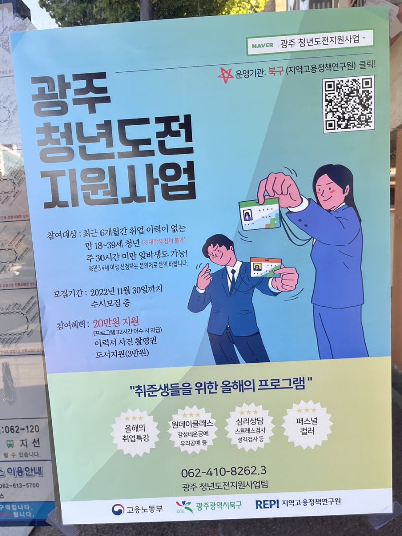 광주청년챌린지지원사업은 취업을 포기한 청년들의 취업의욕을 북돋우고 노동시장 참여와 취업을 촉진하기 위해 맞춤형 프로그램과 참여수당을 제공하는 청년지원사업이다. 지원자는 지난 6개월 이내에 취업 또는 직업훈련 이력이 있어야 합니다. 직업이 없는 18~39세 청년을 지원합니다. 취업활력과 자신감 제고, 진로탐색, 취업역량 강화를 위한 프로그램을 제공합니다. 참가혜택 신청방법입니다. 광주청소년센터 청소년챌린지 지원사업 신청자입니다.