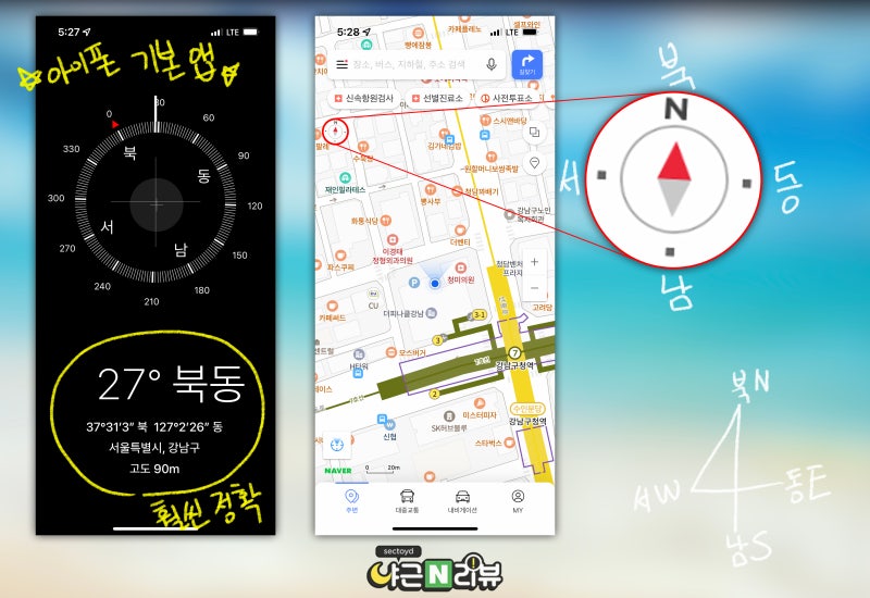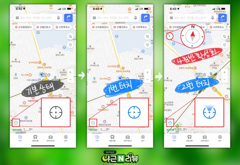네이버 지도 앱을 실행하면 위와 같이 첫 화면에 현재 위치가 표시됩니다. 그리고 네이버 나침반을 사용하시려면 왼쪽 하단의 형광 사각형 박스 안의 아이콘을 클릭하세요. 그러면 오른쪽 화면과 같이 왼쪽 상단에 나침반이 표시됩니다. N으로 표시된 쪽이 북쪽이므로 어느 방향에 있는지, 어느 방향으로 가야 하는지 알 수 있습니다.