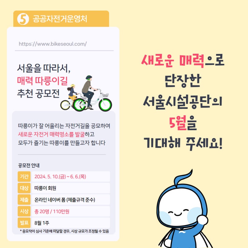 ○ 일시 : 11월 24일 하순 2024년 서울시설공단의 매력적인 사업을 모두 아우르는 서울의 달라진 모습을 생생하게 영상으로 소개하는 서시공 명소맵이 공개될 예정이다. 매력적인 서울의 모습을 만나보세요. 새로운 도약을 시작한 시설공사입니다. 바라보다! 따릉이길 20 스탬프투어