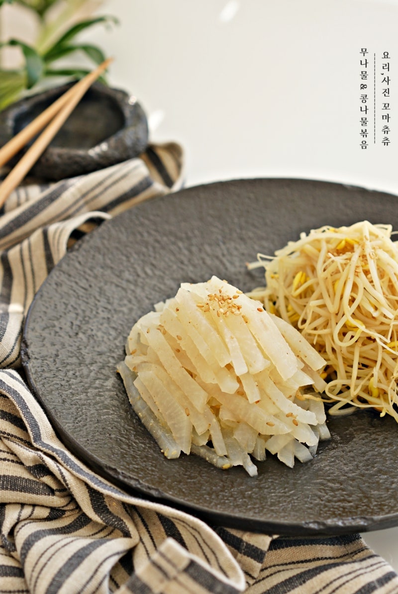 간단하고 맛있는 무나물 만드는 법부터 시작해 보겠습니다. 무채 레시피도 읽어보시고, 간단하게 콩나물볶음 만드는 법도 참고해보세요! 무 400g 참기름 1큰술 식용유 1/2큰술(생략가능) 물 5큰술 꽃소금 1/2큰술 깨소금 1큰술 콩나물 200g 참기름 1큰술 물 5큰술 소금 1/3큰술 참소금 1큰술