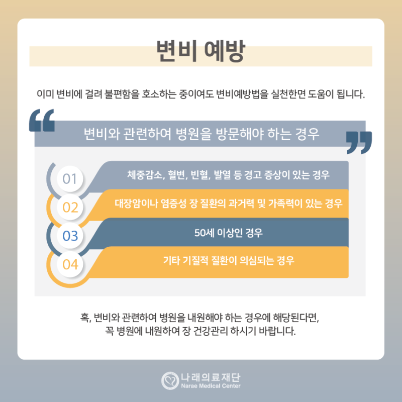 변비가 며칠 동안 지속되는 경우 대처법 일반적으로 변비를 해결하기 위해서는 식습관 개선, 약물요법, 운동요법 등을 통해 변비를 해결합니다. 그래도 변비가 해결되지 않으면 관장, 배변교정, 변비를 일으키는 질환의 치료 등이 있습니다. 1. 변비 직브레드 습관 만성 변비가 있는 경우에도 다음과 같은 습관을 익히면 쾌적한 배변을 하는 데 도움이 됩니다. 1. 일찍 일어나기 2. 아침식사 또는 차 마시기 3. 식이섬유 하루 25mg 이상 섭취 4. 물 하루 2L 이상 섭취 5. 아침 배변훈련 6. 매일 체조, 스트레칭, 걷기 2. 자세 변기에 배변 모습이 잘 보이도록 앉았을 때 앞으로 약간 몸을 기울이면 항문직장 각도가 곧게 펴져 배변하기가 더 쉬워집니다. 변기에 앉기만 하면 몸이 90도 직각을 이루고 대장이 휘어져 배변이 어려워진다. 참고로 기존 변기는 자연스럽게 기울어지기 때문에 변기보다 배변활동을 더 잘 볼 수 있습니다. 화장실을 사용할 때에는 발을 지탱할 수 있는 목욕 의자를 사용하는 것이 좋습니다. 3. 임산부의 변비 해결 여성과 임산부는 여성호르몬의 변화로 인해 남성에 비해 변비가 생기기 쉽습니다. 특히, 임산부가 변비가 있는 경우 해결책으로는 물 섭취량을 늘리고, 삶은 야채 등 식이섬유 섭취량을 늘리며, 태아에게 해롭지 않은 차전자피 등 대변연화제를 섭취하는 것이 좋습니다. 임신 중 감금치질이 발생한 경우 통증으로 인해 조산의 위험이 있으므로 척추마취 후 1~2회의 간단한 수술을 시행합니다. 출산 후 2~3개월 후에 근치 수술을 해야 합니다. 4. 노인 변비 해결 식습관을 개선하고 수분 섭취량과 식이섬유 섭취량을 적당하게 늘립니다. 또한, 가벼운 산책, 스트레칭, 약물치료 등을 병행하는 것이 좋습니다. 3일 이상 배변을 하지 못한 경우에는 관장을 하거나 손가락을 이용하여 대변을 파내는 것이 좋습니다. 5. 운동이나 스트레스로 장을 자극하여 장의 연동운동을 활성화시켜 대변이 잘 배출되고 위의 근육을 강화시켜 변비 해결에도 큰 도움이 됩니다. 변비에 좋은 운동으로는 걷기와 복부와 몸통을 단련하는 운동이 있습니다. 좋은 운동으로는 배 비틀기 운동, 배 흔들기 운동, 배 두드리기 운동, 등 근육 강화 운동 등이 있습니다. 국민체조는 변비에 좋습니다. 변비에 좋은 음식 1. 야채와 과일 시금치, 양배추, 양파, 무, 미나리, 마늘, 파, 생강, 풋고추, 야채는 살짝 데치고 토마토, 레몬, 호박, 가지 등 당분이 적은 과일을 섭취하세요. 좋다. 2. 발효식품 유산균이 많이 함유된 발효식품은 변비에 큰 도움이 되지만 요구르트, 요거트, 김치, 된장, 청국장이 좋습니다. 3. 플라보노이드 녹차, 양파, 감귤류, 블루베리 등에 항산화 및 노화 방지 역할을 하는 플라보노이드가 많이 함유되어 있지만 장 건강과 변비에도 도움이 된다. 또한, 마그네슘 보충제는 변비에 좋은 음식입니다. 마그네슘 보충제는 장의 수분을 증가시키고 대변을 부드럽게 해주기 때문에 변비 완화에 좋지만, 잘 알려지지 않아 잘 알려지지 않은 경우가 많습니다. 마그네슘 함량이 높은 음식에는 해초와 시금치가 포함됩니다. 오늘은 변비의 증상과 원인, 치료방법, 변비에 좋은 음식에 대해 간략하게 살펴보았습니다. 누구나 한 번쯤 겪는 변비 해소에 참고가 되기를 바랍니다.