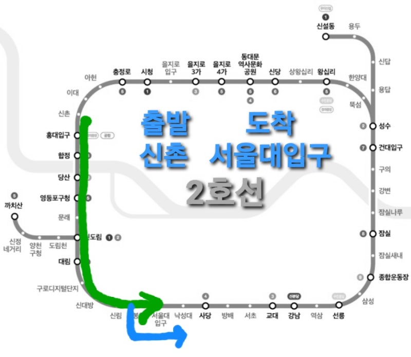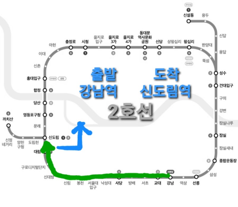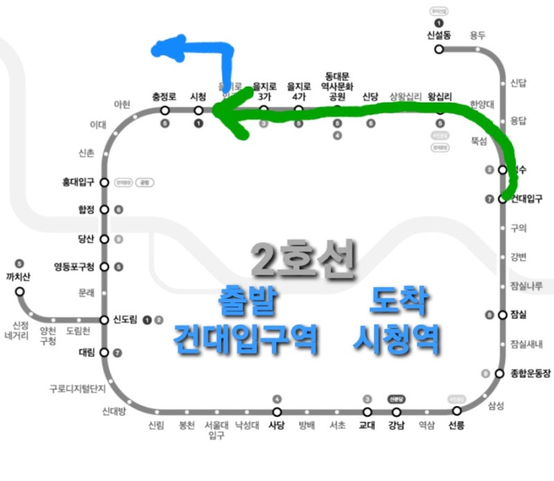 강남에서 홍대까지 2호선을 타고 강남에서 홍대까지 갈 경우 시계방향으로 가는 ‘이너서클’을 이용해야 합니다. 홍대입구로 빨리 가려면 강남 -> 교대방향 이너서클을 타셔야 합니다. 물론 외부 루프를 이용해서 갈 수도 있습니다. 늦게왔다 갔다하면 문제가 될 수 있습니다. 강남에서 건대입구로 갈 때(외부순환 이용)