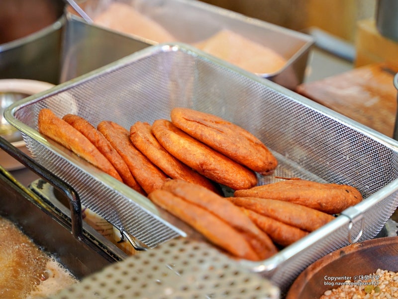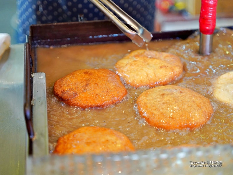 민첩한 손으로 지글지글 끓는 기름에 호떡 반죽을 넣고 노릇노릇해질 때까지 뒤집어 호떡을 튀기듯이 튀겨줍니다 하하.