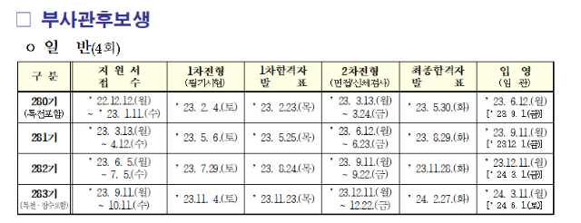 282기 지원서는 2023년 6월 5일(월) 09:00부터 2023년 7월 5일(수) 17:00까지 온라인으로 접수해야 합니다. 일반전형 지원자는 국사능력시험 성적표를 우편으로 제출해야 합니다. 해군 부사관 1차 필기시험은 2023년 7월 29일(토) 서울 등 10개 지역에서 실시되며, 2023년 8월 24일(목) 14시에 1차 합격자가 발표된다. 배경 수표 문서도 온라인으로 다운로드할 수 있습니다. 등록 가능하며, 특별전형은 2023년 7월 6일(목)부터 7월 12일(수)까지 진행되며, 1차 합격자는 일반전형을 위해 2023년 8월 25일부터 8월 31일 17시까지 서류를 우편으로 제출해야 합니다. 당신은 그것을 해야 합니다.