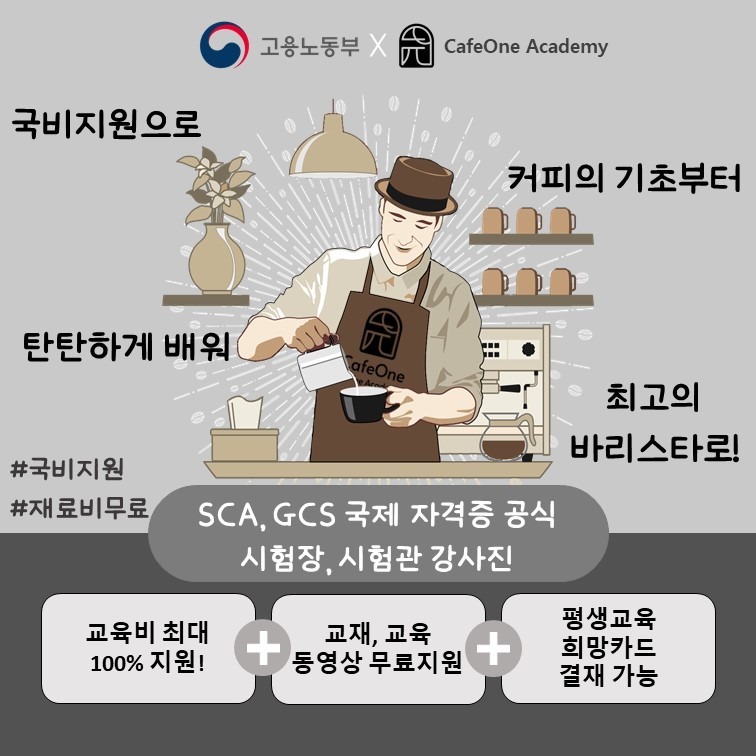 바리 스타의 국가 지원은 1) 내일 학습 카드, 2) 국가 고용 지원 시스템을 갖게되어 기뻤습니다. 1 인당 3 백만 원에서 5 백만 원, 학비의 45-85%가 지원되었습니다.