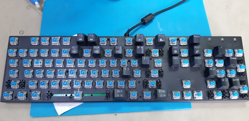 축 스위치가 변색되었습니다. 새 축 스위치를 다시 연결하십시오. 핫스왑이 가능한 키보드라서 그냥 뺐다가 다시 꽂으면 됩니다. 이제 깨끗해졌습니다. 이물질을 모두 제거하고 테스트해 보세요. Epco 키보드 수리. 테스트를 진행하세요. 고장난 키가 있습니다. 핫스왑형이라 키가 잘 접촉되지 않는 부분이 있습니다. 핫스왑 부품을 수리하고 축 스위치를 다시 연결합니다. 축 스위치의 상태가 좋지 않습니다. 이것도 교체 및 수리해드리겠습니다. 키캡이 없습니다. 키캡 빼서 보내주셨는데, 꽂아보니 키캡이 없더라구요. 집에 가지고 있다고 하더군요. 테스트를 마치고 배송해 드립니다. 추석전에 완성해서 발송하겠습니다. Epco 키보드 물 손상 수리 완료